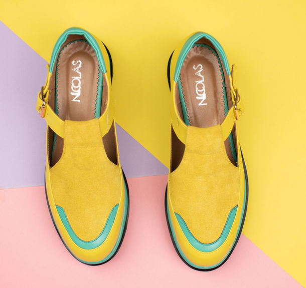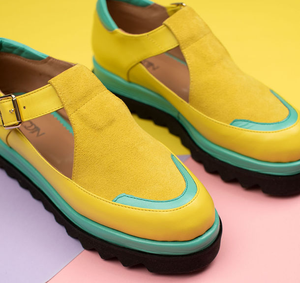 Smiley Mocasini dama din piele naturala intoarsa galbena si piele verde-turquoise. Talpa dubla din microporos este deosebit de usoara si masoara 4 cm. Modelul poate fi personalizat gratuit, la comanda, iar talpile pot fi de culoare neagra sau alba.